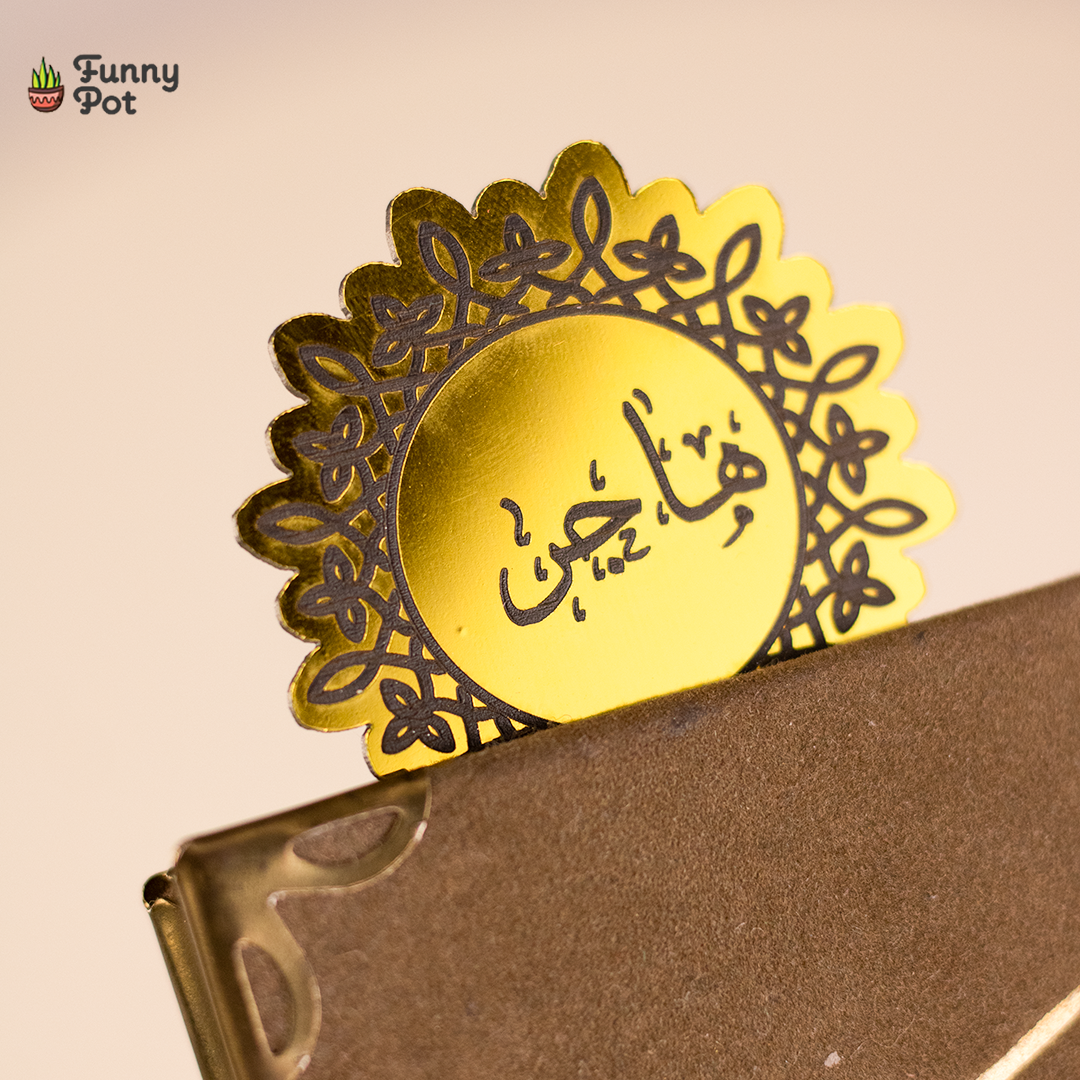 فاصل للمصحف بتصميم فخم وجذاب، مصنوع من أكريليك لون دهبي لامع  المميز فيه إنه بيتعمل باسمك أنت أو اسم اللي تحبه، مقاس الليبل 10 سم المقاس بالكارت 14 سم