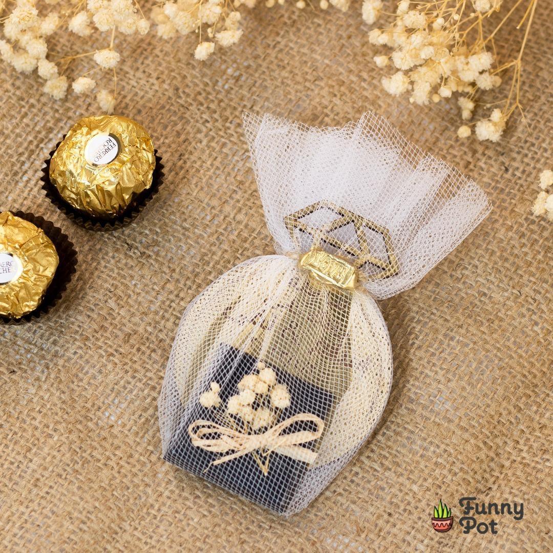 كوستر خشب دهبي محفور عليه الاسماء والتاريخ وجملتك المفضله .. مع قطعه شيكولاته فانسي ملفوف بقماش التل الابيض وديكوريشن بسيط