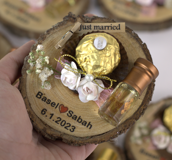 كوستر خشب طبيعي وقطعه شيكولاته فريروروشيه وزجاجه برفيوم بديكوريشن الورد قطر 10 سم
