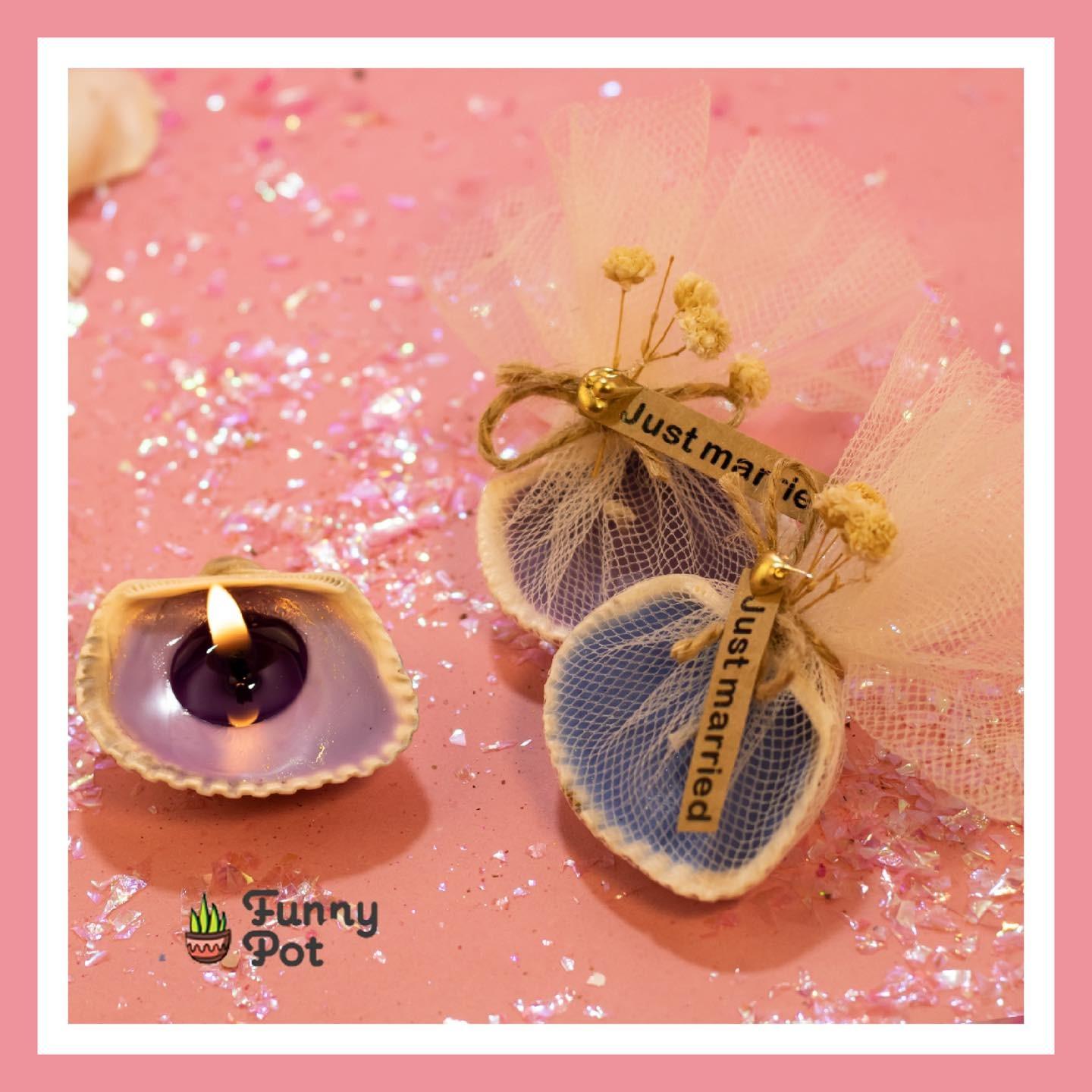 توزيعات ميزه من القواقع والبحريه والشموع الملونه المعطره والمغلفه بقماش التل الابيض وليبول كرافت بجملتك المميزه