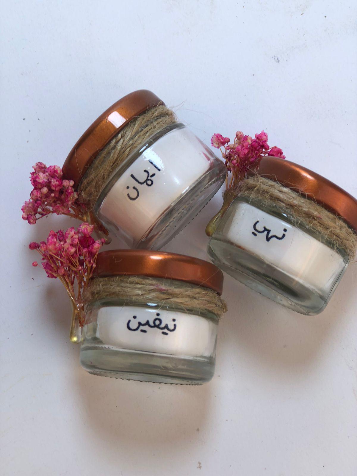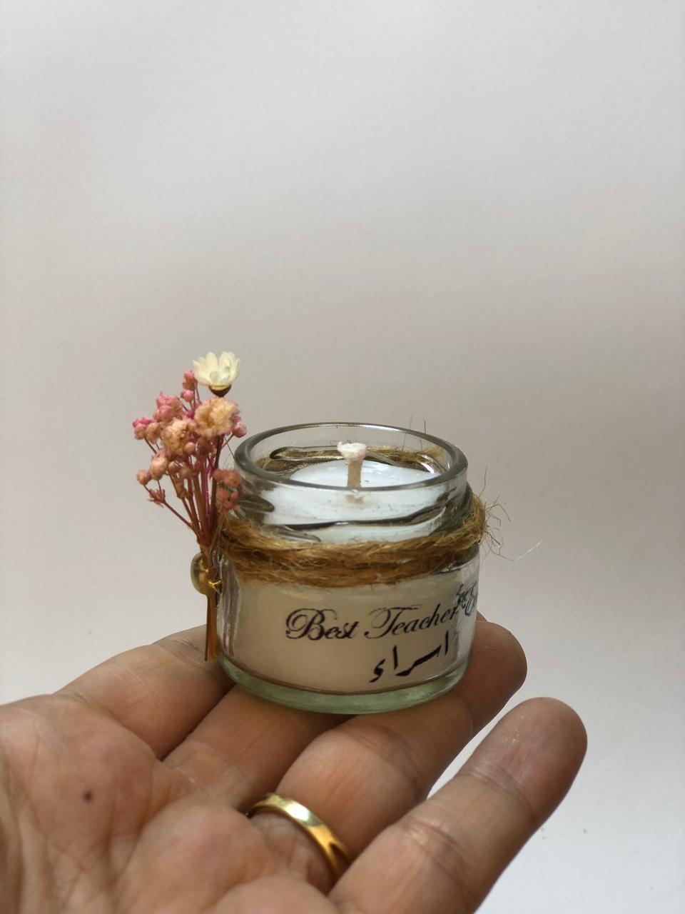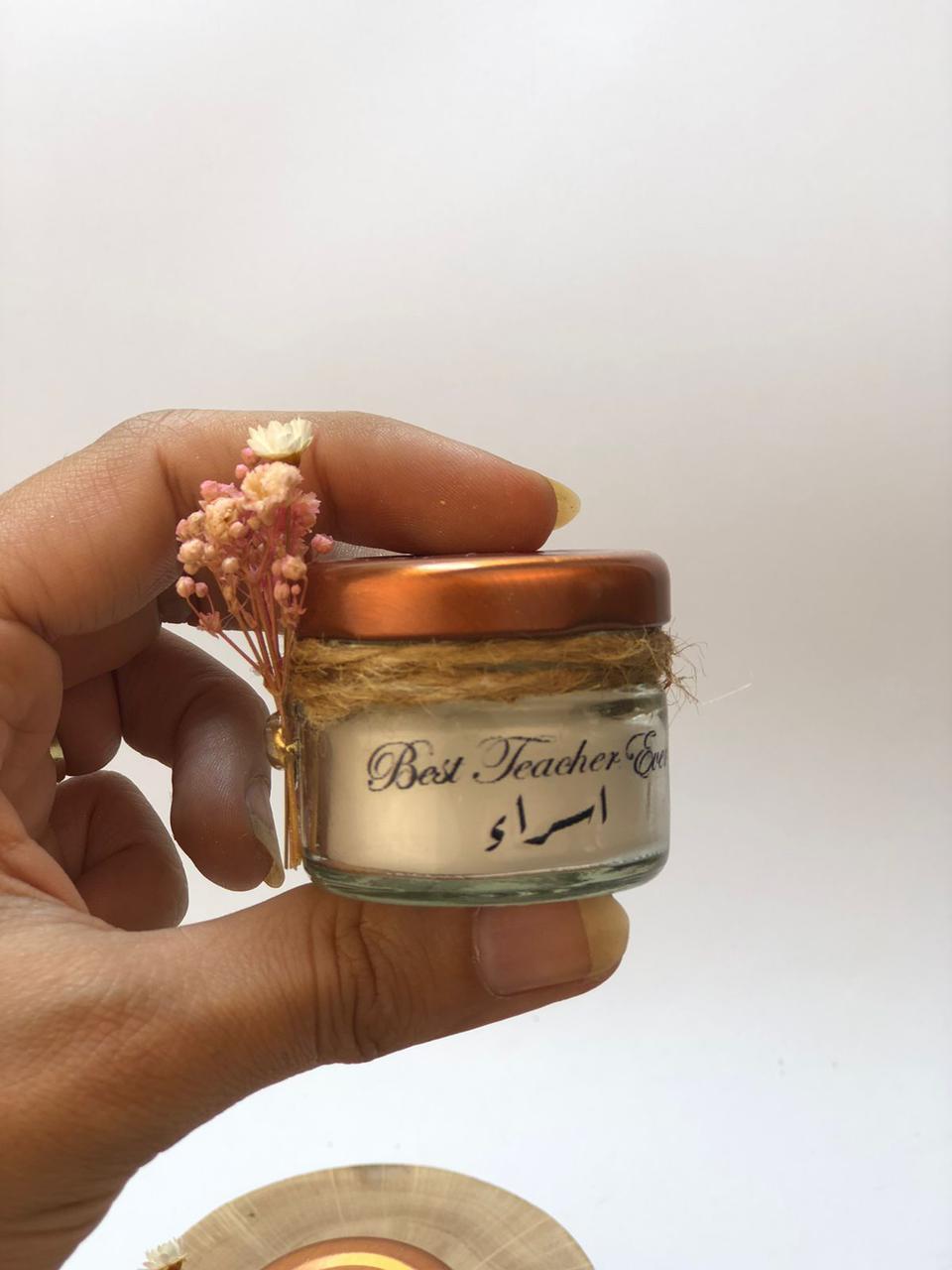ميني جار شمع معطر مميز يتم كتابه الاسماء عليه وديكوريشن من الورد المميز