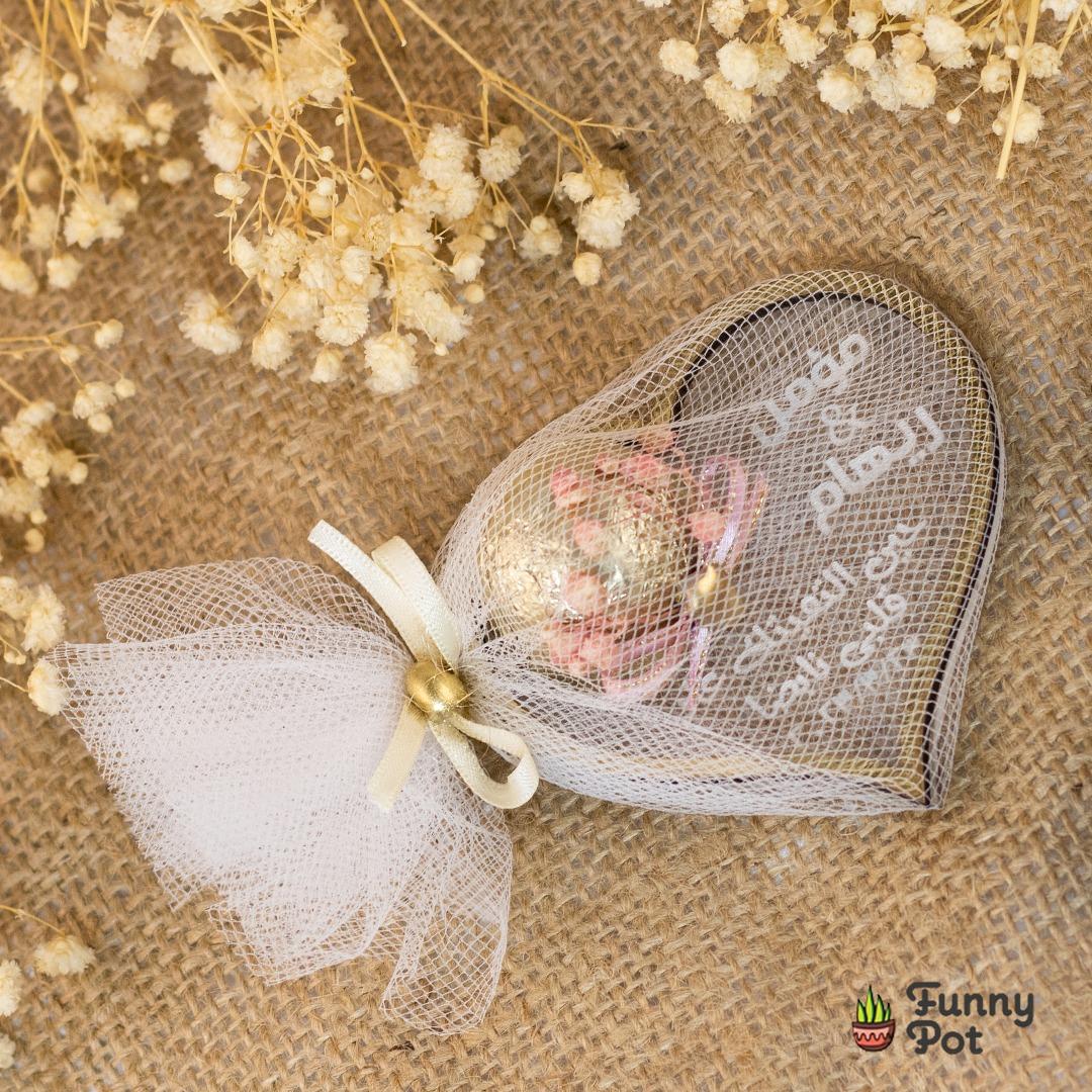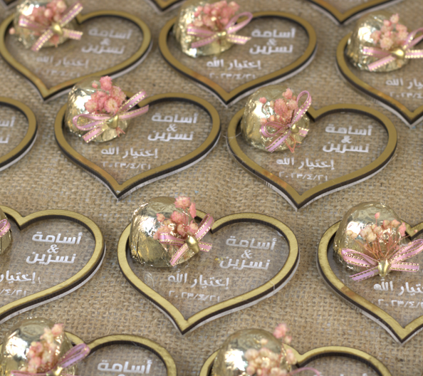 كوستر اكريليك محفور عليه الاسماء بااطار دهبي وشيكولاته فانسي ملفوف بقماش التل الابيض وديكوريشن مميز قطر 9 سم