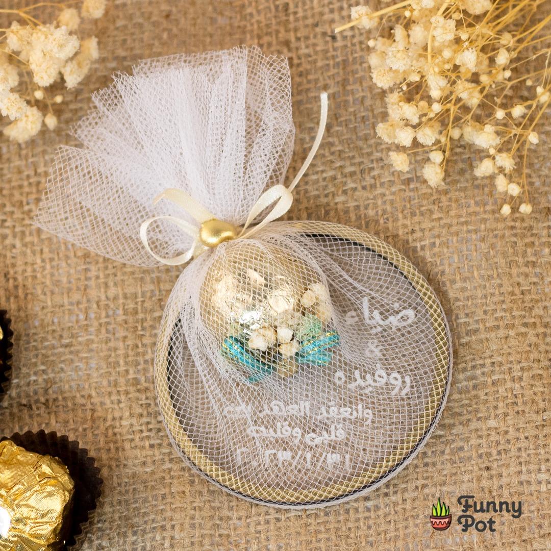 كوستر اكريليك محفور عليه الاسماء بااطار ذهبي مميز وقطعه شيكولاته فانسي ملفوف بقماش التل الابيض وديكوريشن مميز قطر 9 سم