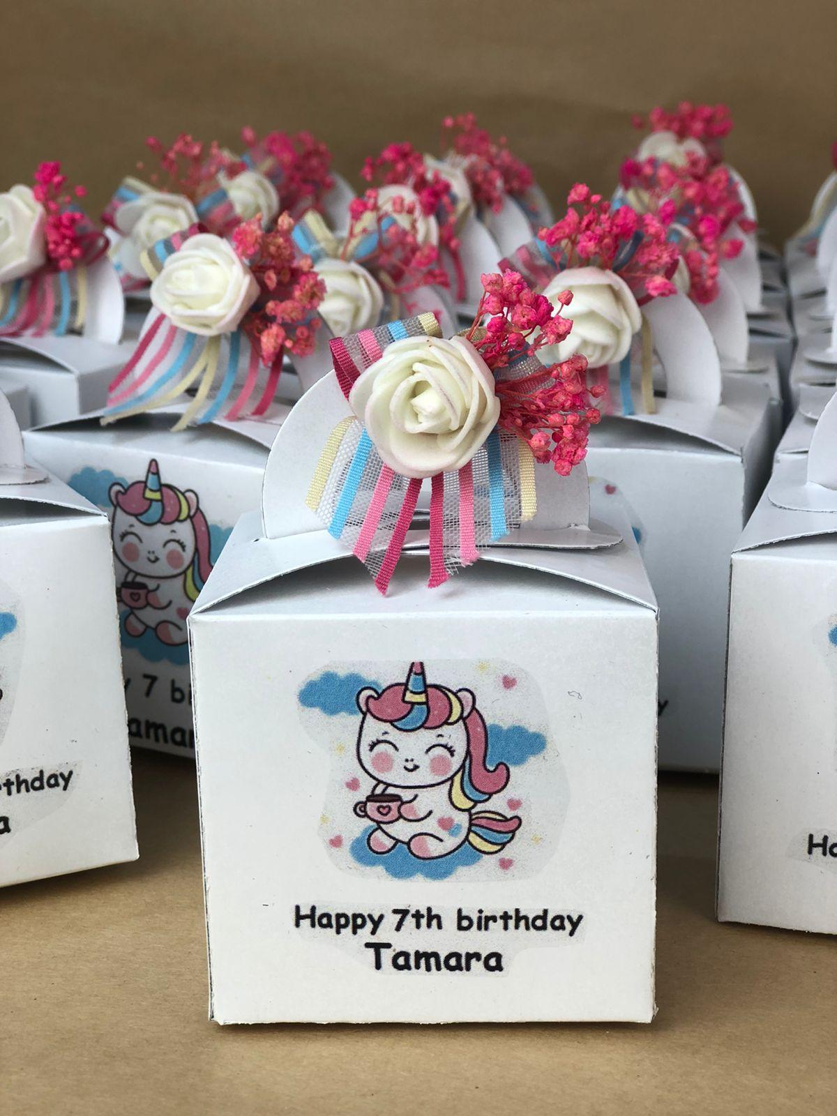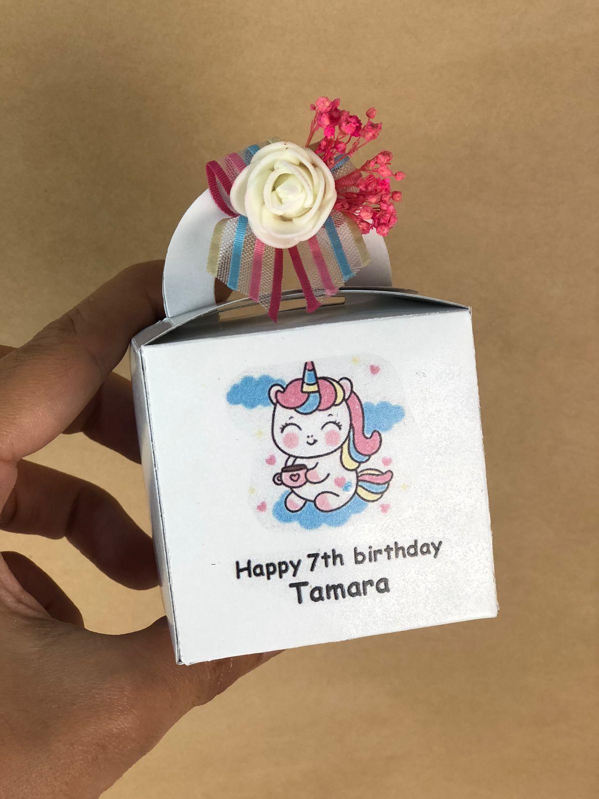 بوكس ابيض مطبوع عليه الاسماء وجمله مميزه من اختيارك وديكوريشن ورد لطيف .. يمكن وضع اي تشكيله كاندي او شيكولاته بداخله
