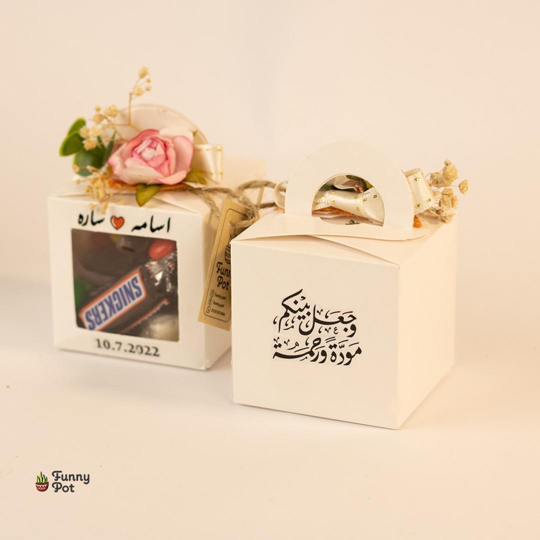 بوكس ابيض مطبوع عليه الاسماء او جملتك المفضله بديكوريشن ورد مميز .. في بنبون وميني تشوكلت