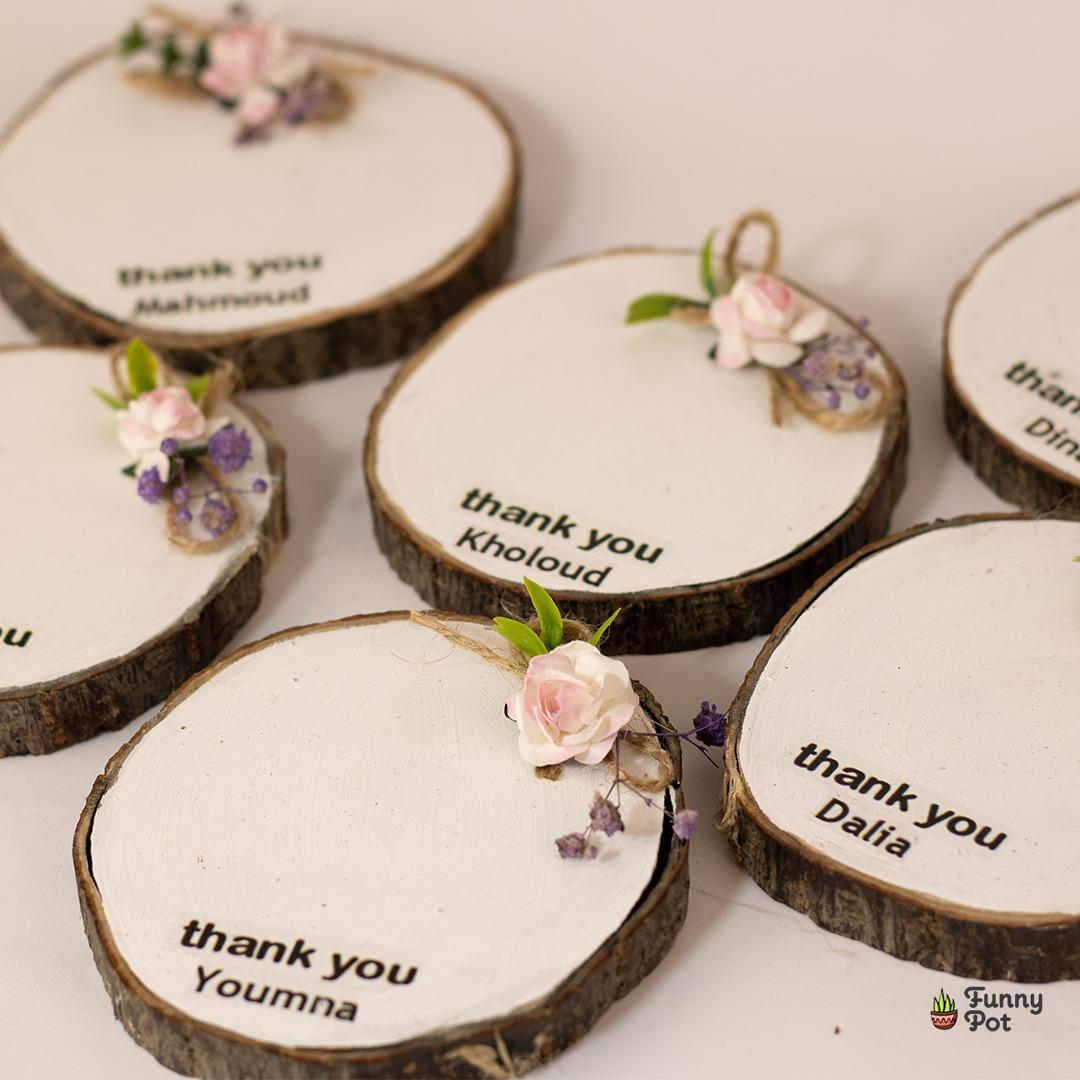 كوستر من خشب الاشجار الطبيعي بديكوريشن ورد مميز وطباعة الاسم او جملة قطر 10 سم