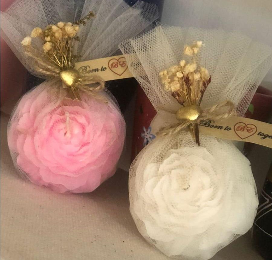 شموع ورده الجوري المعطره ملفوفه بقماش التل الابيض وليبول كرافت بجملتك المفضله وديكوريشن ورد مميز