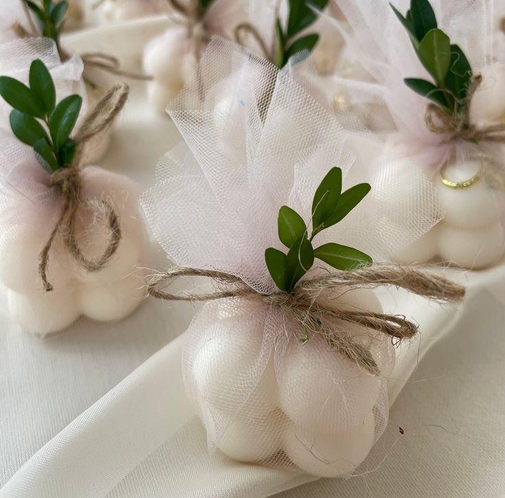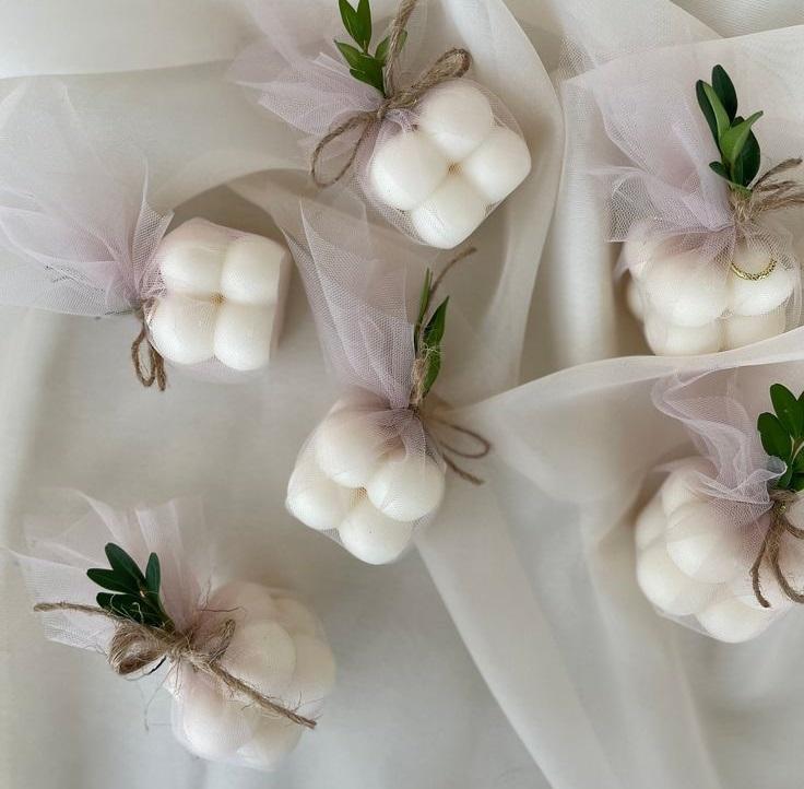 شمعه ميني بابلز معطره ملفوفه بقماش التل الابيض وديكوريشن بسيط (يمكن اضافه ليبول بالاسماء والتاريخ)